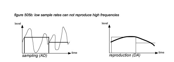 The process of sampling an audio signal every sample interval is visualised in figure 505: the waveform of the audio signal is chopped into discrete samples with a high sample rate (figure 505a) and a low sample rate (figure 505b). It can be assumed that for high frequencies to be reproduced by a sampling system, a high sample rate has to be used. However, a high sample rate implicates that electronic circuits have to be designed to operate with high frequencies, the data transfer and DSP involve a high data rate (bandwidth), and storage requires a high storage capacity. For efficiency reasons, it is necessary to determine exactly how high a sampling rate must be to capture a certain frequency bandwidth of an audio signal, without too much costs for the design of electronic circuits, digital transport, DSP and storage.