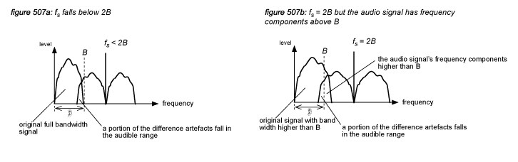 In figure 506c, the human auditory system’s frequency limit is indicated with the dotted line B. If the difference artefact of the 1st harmonic of the sample pulse train at the sample rate fs lies completely above B, then all artefacts fall outside of the hearing range - so the reproduction of the audio signal is accurate inside the boundaries of the audio universe. However, if either the audio signal has a full bandwidth (B) and fs falls below 2B (figure 507a), or if fs is twice the full bandwith B and the audio signal includes frequency components higher than B (figure 507b), the reproduction is no longer accurate because the difference artefacts of the first harmonic fall in the audible range. This phenomenon is called aliasing.