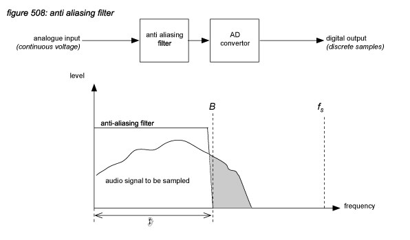 The first conclusion leads to the system design parameter of selecting a sample frequency of at least 40 kHz to allow an accurate representation of signals up to the hearing limit of 20 kHz. But the second conclusion makes it very difficult to do so, because most audio signals that come into a digital audio system - eg. the output of a microphone - possess frequency components above 20 kHz. With a sampling frequency of 40 kHz, the frequencies above 20 kHz must be attenuated by an analogue anti aliasing (low pass) filter with a brickwall slope to prevent them from entering the audible hearing range.