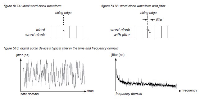 Jitter in a device’s word clock is not a problem if the device only performs digital processes - a MAC operation in a DSP core performed a little earlier or later than scheduled gives exactly the same result. In digital audio systems, jitter only causes problems with A/D and D/A conversion. Figure 519 shows that a sample being taken too early or too late: the jitter timing error - results in the wrong value: the jitter level error. As time information is ignored by the DSP processes and distribution of a digital audio system, only the level errors of an A/D converter are passed to the system’s processes. At D/A converters however, samples being output too early or too late distort the audio signal in level and in timing. The listener to the system hears both A/D and D/A converter jitter level errors, but only the D/A converter’s timing error.