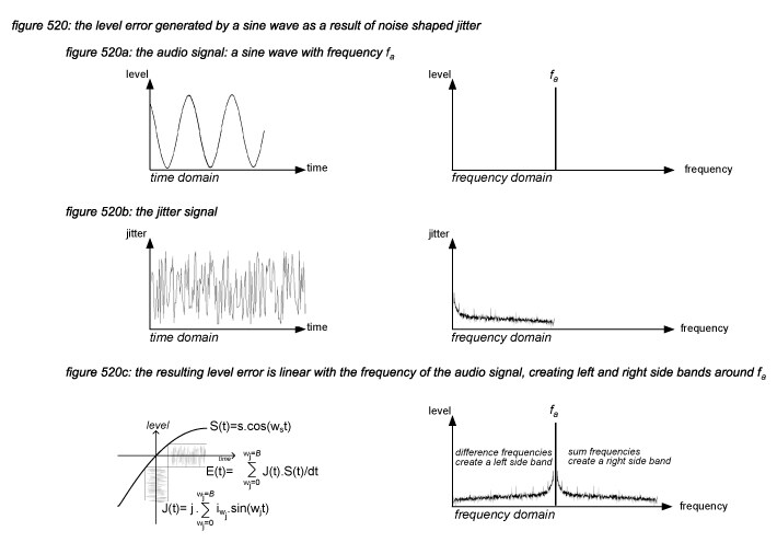 The result for a single frequency component in the audio signal is presented in figure 520c. For sinusoidal jitter, the term J(t).S(t)/dt can be represented by the expression E(t) = s.j.ws.{1/2 sin((ws+wj)t)+ 1/2 sin((ws-wj)t)}. Adding up all frequencies in the jitter spectrum, it can be shown that the jitter spectrum folds to the left and the right of the audio frequency - this ‘jitter noise picture’ can be produced by any FFT analyser connected to a digital audio device that processes a high frequency sine wave. Repeating this calculation for every frequency component in a real life audio signal gives the resulting total jitter level error. The overall peak value of the jitter level error (E) is linear with the derivative of the audio signal: the higher the frequency, the faster the signal changes over time, the higher the jitter level error. The worst case is a 20kHz sine wave, generating a jitter level error at a 64dB lower level. As most energy in real life audio signals is in the low frequencies, the majority of the generated jitter level errors will be far below -64dB.