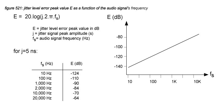 Assuming a 0dBfs sine wave audio signal with a frequency of 10kHz as a worst case scenario, a jitter signal with a peak level of 5ns will generate a combined A/D and D/A jitter noise peak level of:
