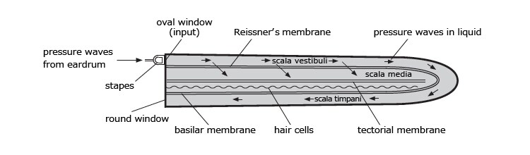 The membrane is stiff and narrow at the beginning, near the oval window, and wide and sloppy at the end. This causes the membrane to resonate at high frequencies close to the oval window and at low frequencies at the end, ‘tuning’ each hair cell to a specific frequency range. This mechanism basically constitutes a 3500-band real time spectrum analyser!