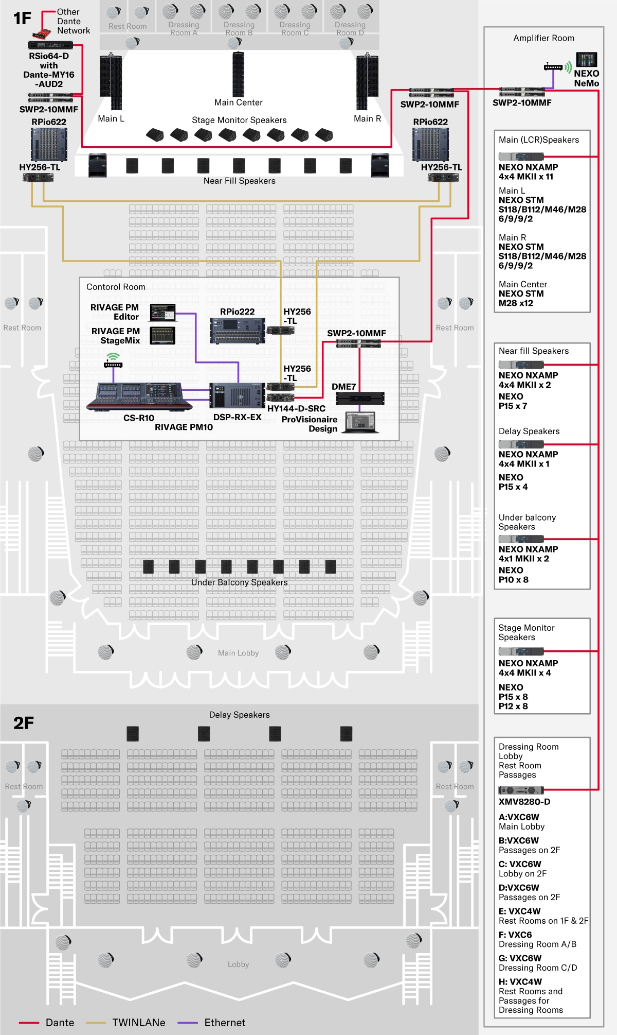 This is a complete sound system that can service the main hall of a theater and its ancillary facilities. The main hall features a RIVAGE PM mixing system providing premium sound quality and outstanding operability, and also features dedicated functions specifically for theatrical performances. The main hall system is rounded out by powerful NEXO STM array speakers that deliver clear and consistent sound to the audience, while the ancillary areas rely on a matrix system featuring a DME7 processor for flexible routing and comfortable mixes of live performances, background music and more. All audio connections are redundant, providing the reliability and peace of mind that is crucial for performance-related applications.
