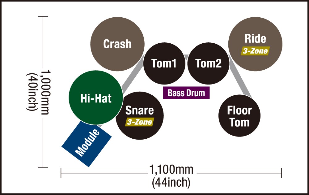 - 3-zone pads for the snare, and ride. The cymbals can be choked and muted. Ride cymbal equipped with a hit point detection function (positional sensing)