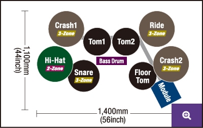 - 3-zone pads for the snare, crash, and ride. The cymbals can be choked and muted. The ride cymbal is equipped with a hit point detection function (positional sensing)