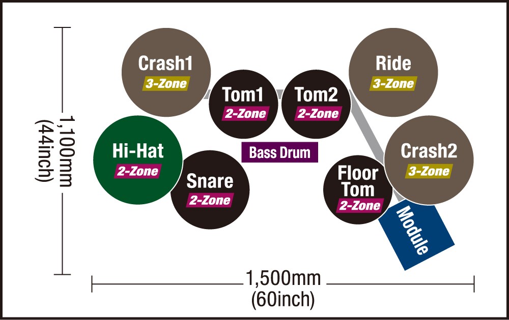 • The snare/tom/hi-hat pads are equipped with two playing zones and the cymbal pads all have three zones