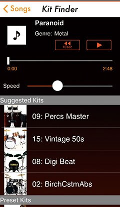 The "Kit Finder" function enables you to quickly and easily play along with your favorite songs. Select a song from your music library via Kit Finder and Kit Finder will suggest a Preset Kit suitable for that song.