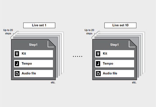 The new "Live Set" function allows you to freely arrange and configure various combinations of kits, tempos, and audio files and backing tracks, and recall them with a single touch. You can also create various click setups to accommodate different playing needs.