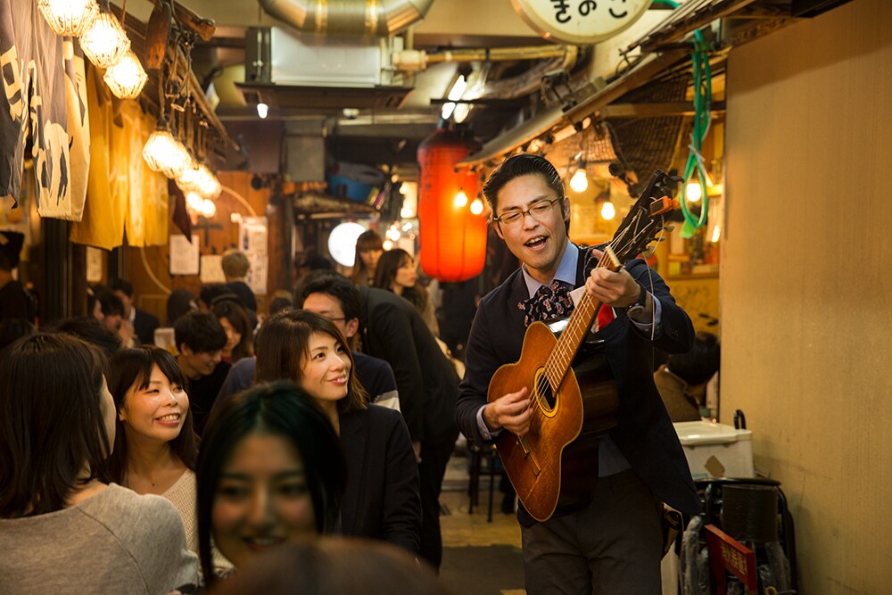Nakayama's home turf is Ebisu Yokocho, a popular arcade filled with thirteen izakayas and restaurants. On any given night, Nakayama spontaneously approaches groups and relies on his intuition and communication skills to tailor a special performance for them based on social cues he detects.