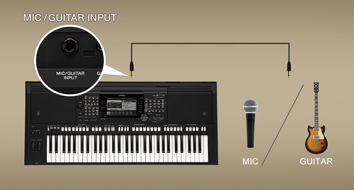 PSR-S775 kommer laddad med Mic- och gitarringång. Plugga helt enkelt in en mikrofon och använd PSR-S775's effekter. Eller koppla in en gitarr och testa de inbyggda gitarreffekterna.