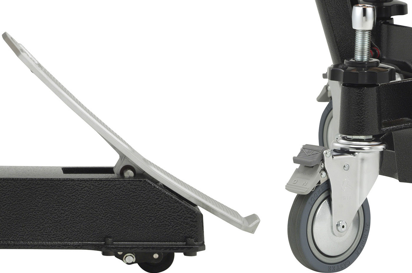 Large main casters are supplemented by a third caster below the pedal, allowing the instruments to glide smoothly and easily.