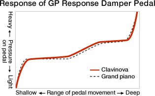 Dämparpedalen är ett viktigt element i pianospelandet eftersom den har stor inverkan på ljudet när den trampas ned. Clavinova beter sig på samma sätt som ett akustiskt piano genom att kontinuerligt känna av hur mycket pedalen trampas ned eller släpps upp för att slutligen justera tonens förlängning och utklingning. Dessutom återskapar GP Response Damper Pedal den typiska flygelkänslan genom ett mindre motstånd i början och tyngre känsla när pedalen börjar ge effekt. Resultatet blir att man får en bättre kontroll.