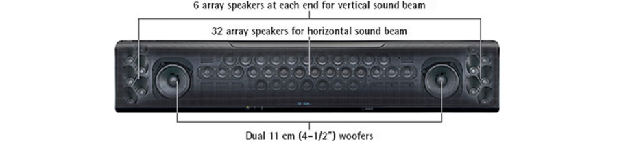 • Sex högtalare på vardera sida skjuter ljudet upp i taket, så att kännslan och upplevelsen blir att ljudet kommer ovanifrån. Detta för att återge 3D surroundljud, motsvarande 7.1.2 kanaler.