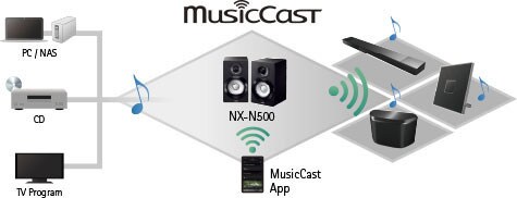 Spela upp innehåll från en annan MusicCast enhet, eller från en Blu-ray eller CD-spelare som är ansluten till en MusicCast produkt – all musik blir tillgänglig i alla rum i huset. Om du har musik lagrad på en PC eller NAS kan du via DLNA spela upp den musiken också, allt som krävs är att det är anslutet till samma nätverk. Du kan även dela ut extern inkopplade ljudkällor som TV eller BD-spelare. Ljud du skickar till NX-N500 med bluetooth kan också skickas vidare till en annan MusicCast enhet i ett annat rum.