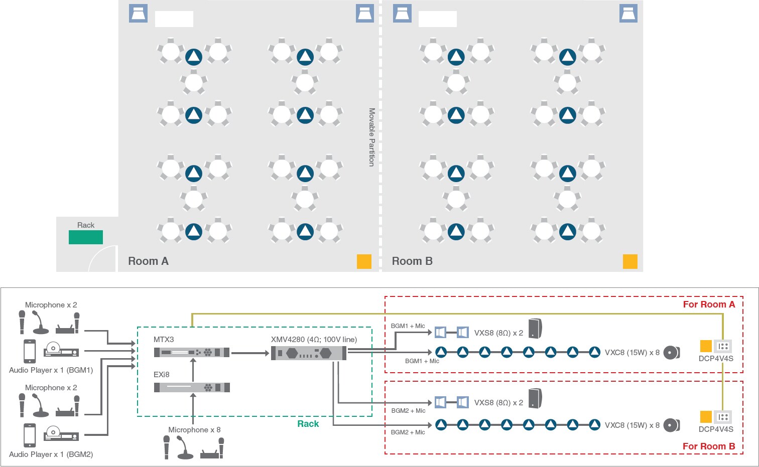 This is a fairly common hotel banquet room or multi-purpose hall scenario that can be effectively served by the following system. Room A and Room B in the system example are normally used independently for meetings, parties, or other events, and are therefore equipped with audio systems that can be operated separately. The Yamaha MTX3 is a convenient matrix processor that can accept input from multiple audio sources and microphones and route that audio to specified speaker systems. The EXi8 is handy when you want to increase the number of available microphone inputs, for example. DCP4V4S control panels installed in each room can be set up to allow remote control of microphone level and on/off switching, that are flexibly set as required with the MTX-MRX Editor software. When the partition is removed and the rooms are combined to form one larger space, an appropriate setup that has been pre-programmed using the MTX-MRX Editor can be recalled via a single button, instantly setting up the system for central control.